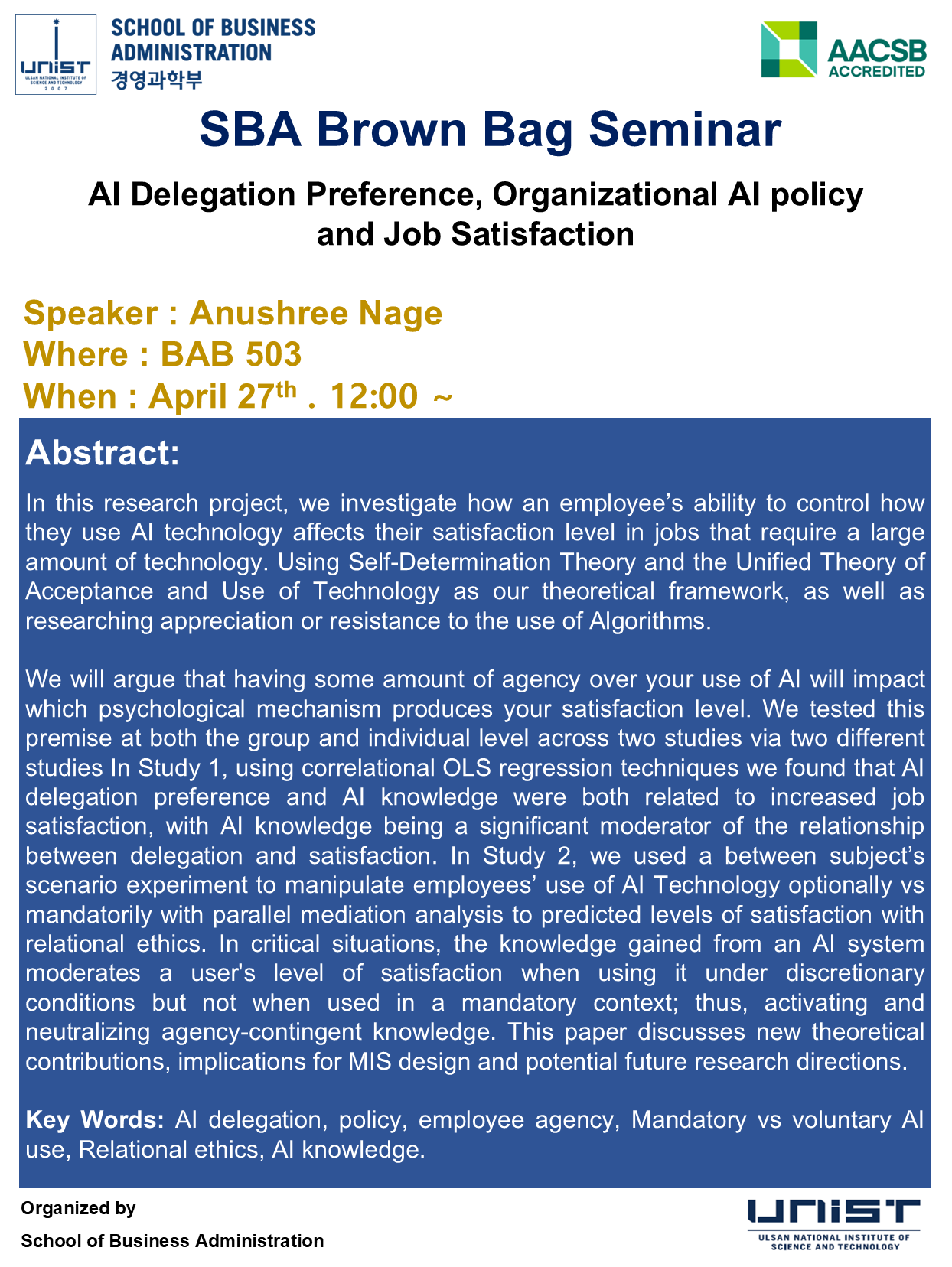 [2026 SBA Brown Bag Seminar] AI Delegation Preference, Organizational AI policy and Job Satisfaction 2026.04.15