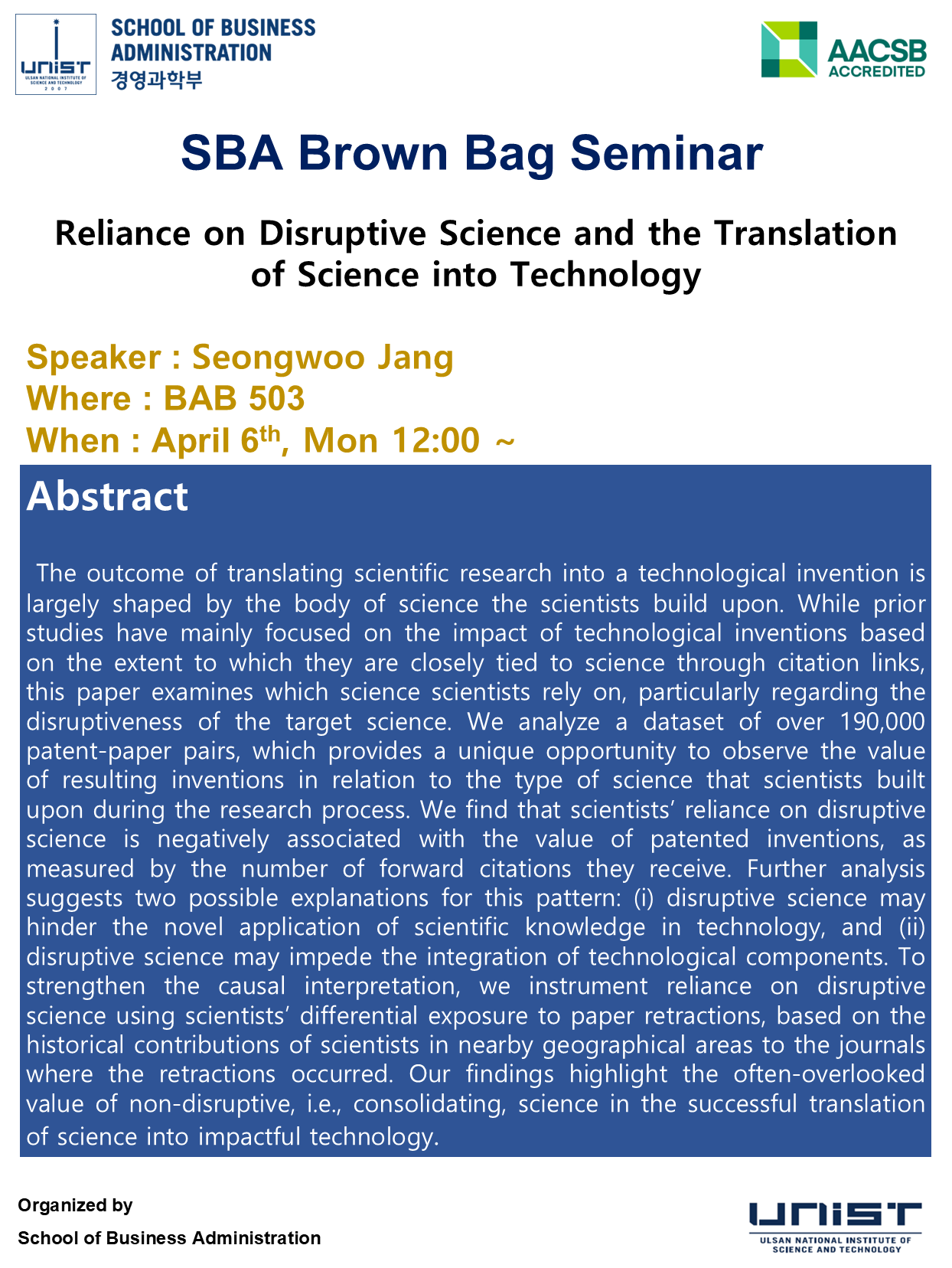 [2026 SBA Brown Bag Seminar] Reliance on Disruptive Science and the Translation of Science into Technology 2026.03.23